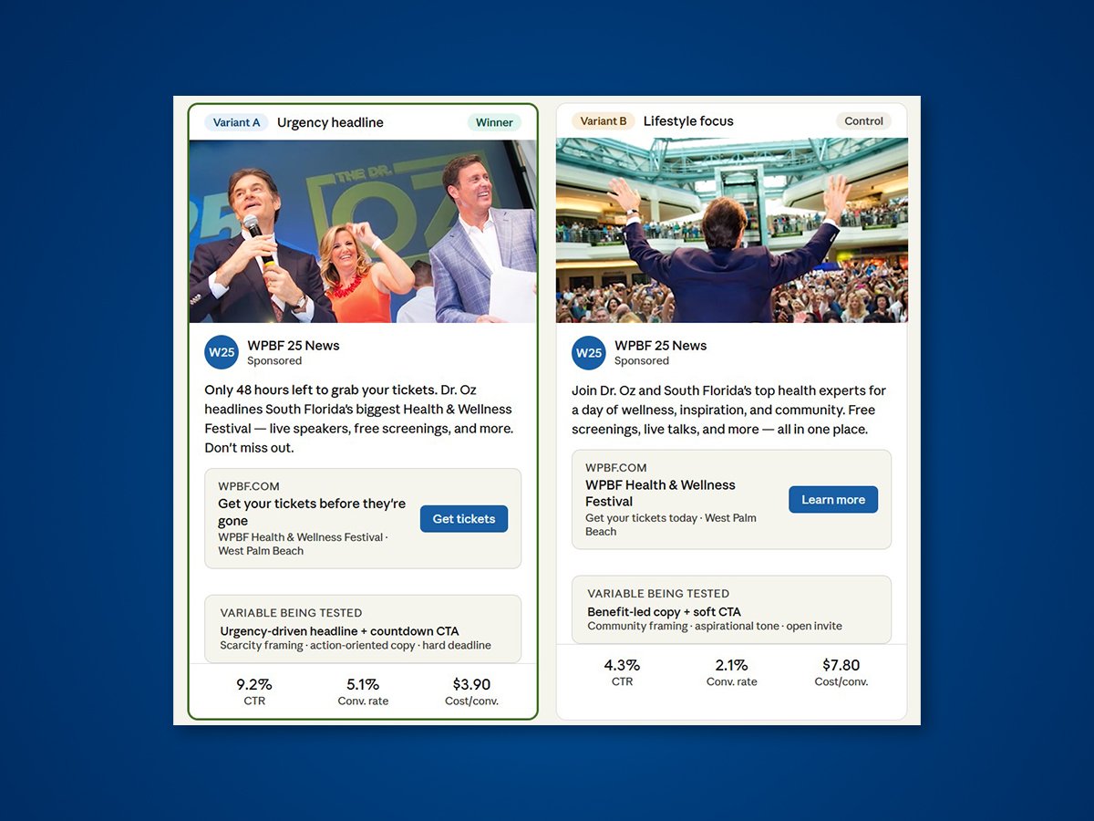 WPBF 25 partnered with Dr. Oz to bring a large-scale Health and Wellness Festival to South Florida — and needed a full social campaign to sell it out. I led the creative direction and campaign execution across paid Meta placements, email, and organic social, building a cohesive promotional identity from the ground up and driving ticket sales through performance-optimized content at every stage of the funnel.