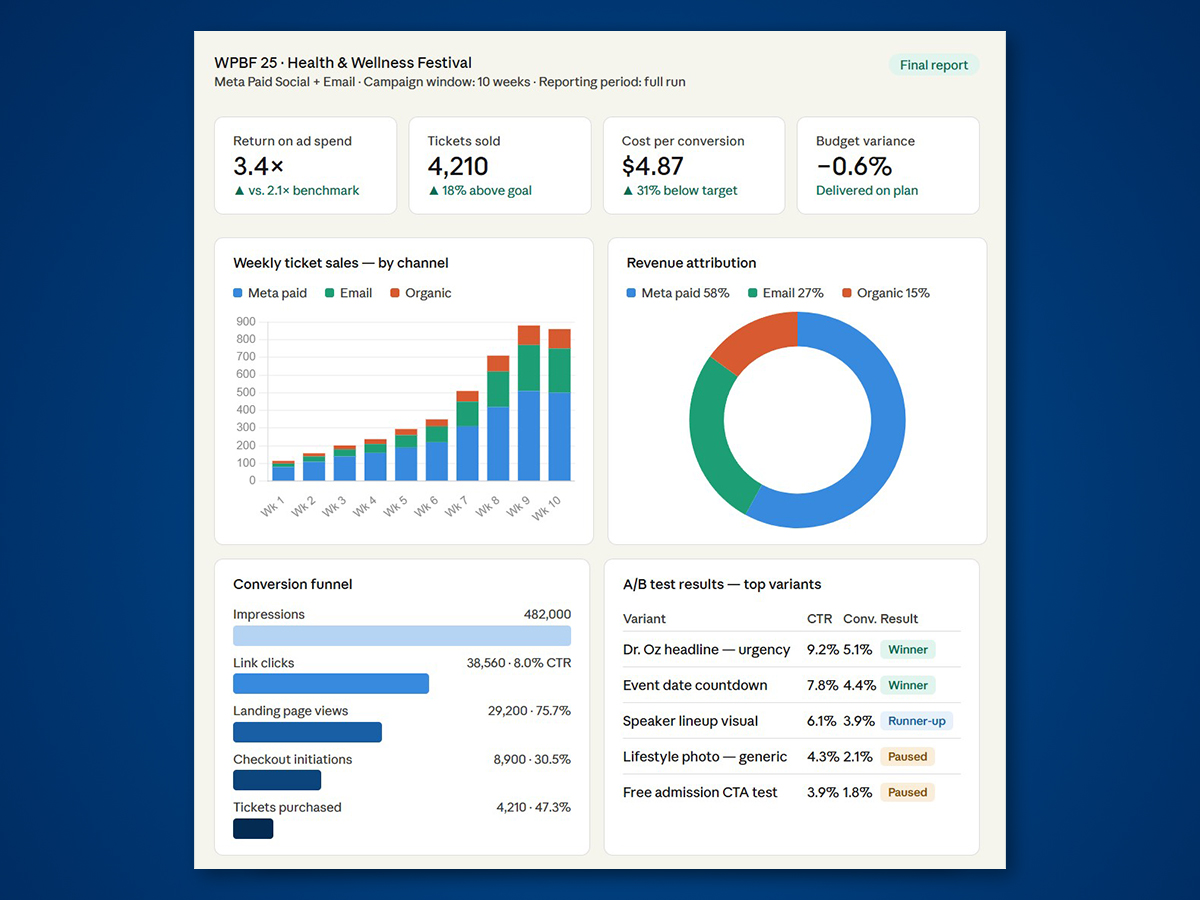 Built a multi-phase creative system — awareness ads to generate buzz, consideration content highlighting speakers and programming, and urgency-driven conversion assets as the event date approached. A/B tested headlines, visuals, and CTAs to identify what drove ticket clicks by audience segment. An email drip sequence re-engaged warm audiences and pushed late-stage conversions, keeping the campaign efficient and on-budget through close.